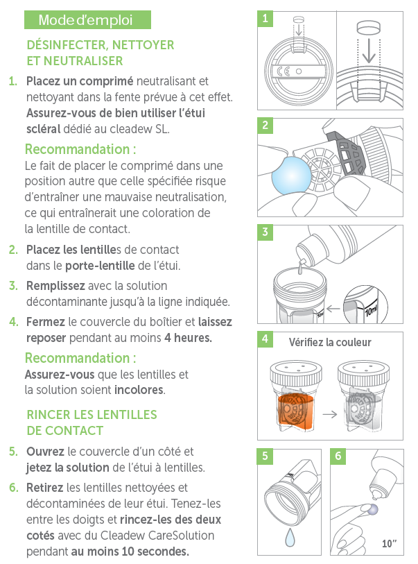 Ne posez pas les lentilles de contact directement sur l’œil après utilisation de la solution de nettoyage sans les avoir rincées à l’aide d’une solution saline en unidose sans conservateurs.